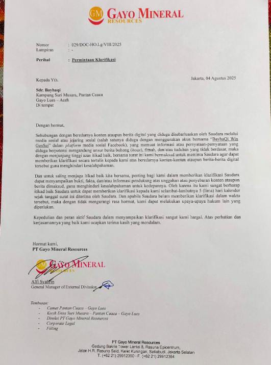 KBBAceh.News | Gayo Lues – PT Gayo Mineral Resources (GMR) diduga membungkam suara kritisi warga yang menolak kehadiran aktivitas tambang emas di Kabupaten Gayo Lues Provinsi Aceh, bahkan bernada ancaman dan dituduh menyebarkan berita bohong (hoaks). Baihaqi, seorang warga Gampong Pantan Cuaca Kabupaten Gayo Lues Provinsi Aceh, menerima surat bernada tekanan pada tanggal 4 Agustus 2025 lalu. Ancaman itu dia terima setelah ia gencar menyuarakan penolakan lewat akun media sosial terhadap hadirnya aktivitas perusahaan tambang emas di wilayah itu.