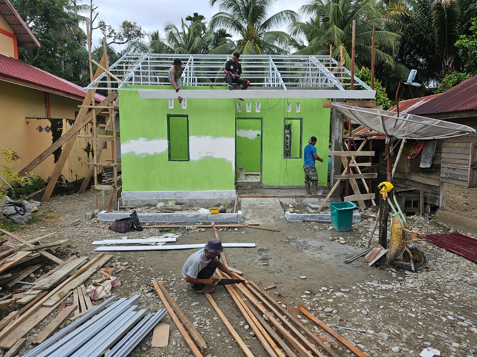 Latkol Inf Faiq Fahmi juga menuturkan, target pemasangan kerangka atap di rumah itu diupayakan secepat mungkin terselesaikan, sehingga nanti tinggal finishing pemasangan atap dan melanjutkan pengecatan.