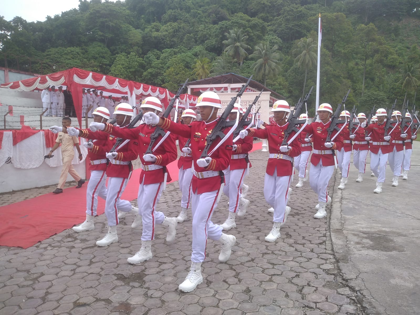 Pengibaran bendera Merah Putih yang diiringi lagu kebangsaan Indonesia Raya, berhasil ditunaikan dengan baik oleh para Team Paskibraka Aceh Selatan. Sang Merah Putih tampak gagah berkibar di Lapangan Naga Tapaktuan, Aceh Selatan.